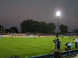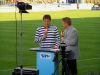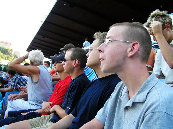 Od západu ešte pieklo slnko, usádzame sa teda pod krytou tribúnou na východnej strane hriska. Nitrianski ultras si po určitom období bojkotu opäť našli cestu na štadión, kvôli telke dokonca vraj chystajú nejaké choreo. Z Bratislavy taktiež prišlo zopár skalných, no tí budú oproti domácemu publiku v značnej nevýhode. Pred zahájením zápasu o 17:00 hodín ešte s Janom chvíľu diskutujeme o zostave, sledujeme televízne štúdio futbal s hosťom Igorom Demom, nachádzajúce sa len pár metrov od nás, a napokon nástup futbalistov oboch družstiev. Nitra sa prekvapivo drží na čele ligovej tabuľky, zatiaľ čo Artmedia naposledy doma iba remizovala s Košicami. Prognózy veštia zaujímavý duel, pričom ja osobne tipujem víťazstvo hostí – argumentom mi je, že každá séria sa raz musí skončiť.