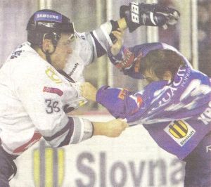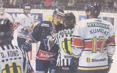Poprad - Slovan /1.kolo playoff/: vyraďovaciu časť sprevádzajú emócie - pästný súboj Hančáka s Krotákom |