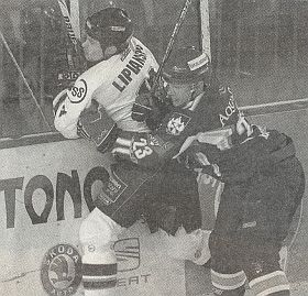 Poprad - Slovan /1.kolo playoff/: súboj Laža s Popradčanom Piatakom |