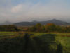 Na zostupe vedú istý úsek súbežne červená i modrá, obe sa potom rozdeľujú na rázcestí Nad Bílkou (650 m.n.m.). Z oboch najbližších obcí, Bílky a Černčíc, prúdi na Milešovku pomerne dosť turistov. Keďže sa nikam neponáhľam a chcem si trasu mierne predĺžiť, zostupujem po modrej do Černčíc. Za vyústením z lesa sa chodník ťahá v úzkom páse medzi nepriechodným porastom a drôteným plotom ohraničujúcim priľahlý háj, čo je problém vzhľadom nato, že chodníkom pretekajúca bystrinka ho mení na číre bahno. Černčice, ktoré som vyššie nazval obcou, no v skutočnosti sa jedná o neveľkú osadu s pár domami, práve opúšťa skupina postarších nemeckých turistov. Moje ďalšie kroky vedú východ, kde zelená trasa vedúca širokou, na chôdzu príjemnou poľnou cestou, prechádza lúkami s obmedzeným výhľadom na Krušné hory, do susednej Bílky.