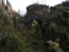 Súvislá oblačnosť sa pozvoľna trhá do nevýrazných bielych pásov, nad hlavou sa mi otvára jasné modré nebo. Na zablatenej poľnej ceste stretám niekoľko menších čried sŕn, vzápätí miznúcich v kroví, pred obcou Březno ma z idylky vyrušuje akýsi báger. V obci sa presne o deviatej nakrátko zastavujem, posilňujem sa keksom a nahliadam do mapy. Za Březnom opäť naberám stúpanie, spočiatku len mierne, kráčam širokou cestou krížom cez pole a vstupujem do lesa. Opäť moje kroky skrížila črieda sŕn, ktoré ma zrejme nezacítili ani nezačuli, takže sa mi k nim podarilo priblížiť na niekoľko metrov. Pod Ostrým sa z modrej trasy stáčam na jednosmerku vedúcu na vrchol, na zrúcaninu hradu a vyhliadku v jednom. Pri ceste na vrchol míňam zasutené svahy a kamenné polia, tvorené gravitačne premiestnenými ostrohrannými blokmi bazaltu. Pomedzi múry hradu Ostrý, vstavané do skalných stien s náznakmi stĺpcovitej odlučnosti, vystupujem na najvyšší bod vrchu (553 m.n.m., 9:40 hodín), odkiaľ sa mi ponúka výborný výhľad na okolie. Oblačnosť a ranný opar sa už takmer úplne rozplynuli a v celej kráse odhalili kužeľovité vŕšky vystupujúce z mierneho reliéfu.