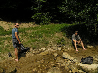 Z hrebeňa klesáme od Rázdelia lesnými cestami naprieč bukovým lesom, až v závere absolvujeme prudšie klesanie. Po napojení sa na asfaltovú cestu trávime niekoľko minút pri potoku, kde si v priezračnej studenej vode chladíme nohy po členky. Asfaltka nás po krátej chvíli privádza do obce Omastiná (334 m.n.m., 13:30 hodín), odkiaľ v poludňajšej páľave pokračujeme v zostupe dolinou rovnomenného potoka. O niekoľko zákrut, v ktorých je v zárezoch možné opäť sledovať uloženiny paleogénu, sa ocitáme v osade Karolintál. Po krátkom výstupe dosť poničenou asfaltovou cestou sa vraciame do Uhrovského Podhradia. Túru končíme o štvrť na tri, teda pomerne skoro. Kolegom som ešte navrhoval možnosť zastaviť sa v Štúrovom múzeu v Uhrovci či vybehnúť na Jankov vŕšok (prípadne sa opäť pokúsiť o zdolanie hradu ;), no už akosi nie je záujem. Čaká nás teda už iba cesta domov, tentoraz cez Topoľčany. S Viliamom sa na záver ešte zastavujem na zmrzline v Zbehoch.